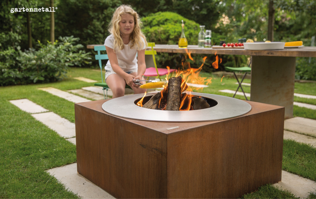 Herbstzeit ist auch Grillzeit – verlängern Sie die Gartensaison mit eine Feuerobjekt aus Cortenstahl mit Holzbefeuerung