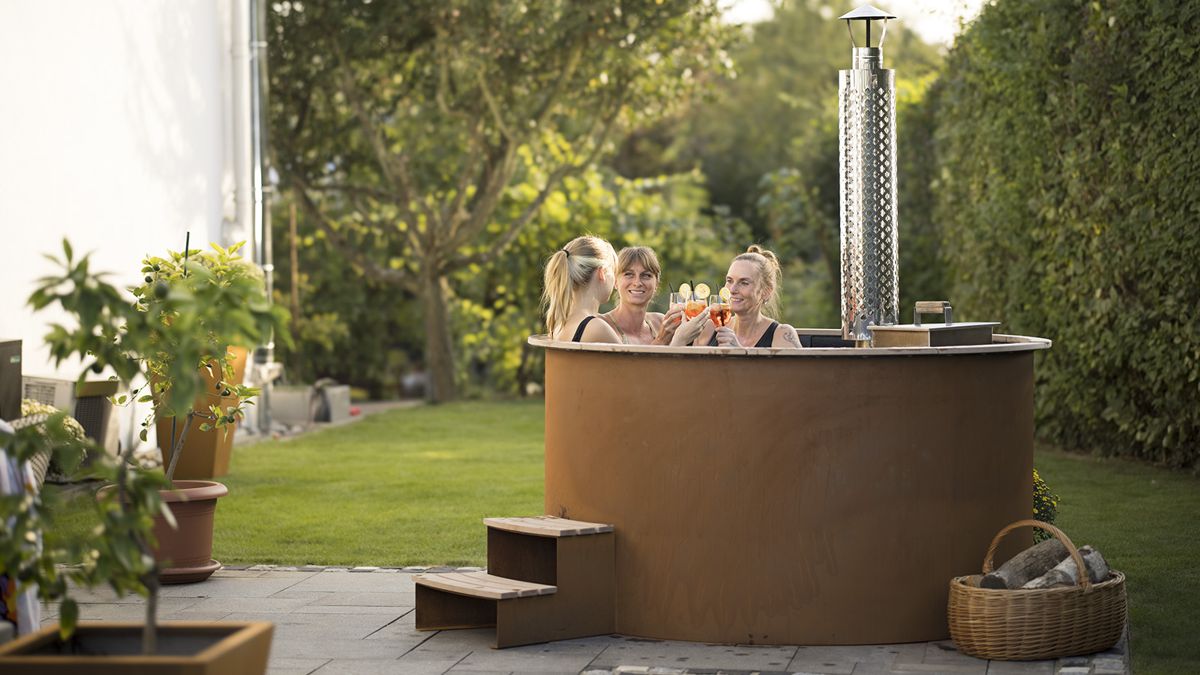 1850 x 1850 x 1000 mm | 245 kgBadefass AQUA LUND mit Sitzbank und Holzofen, Prototyp