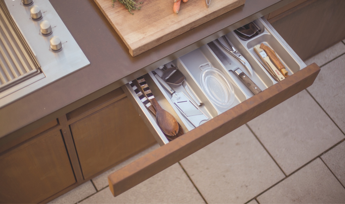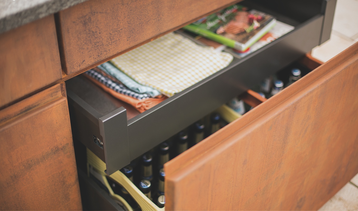 Integrierte Griffleiste an Schrankauszug oben und an Schublade von unten