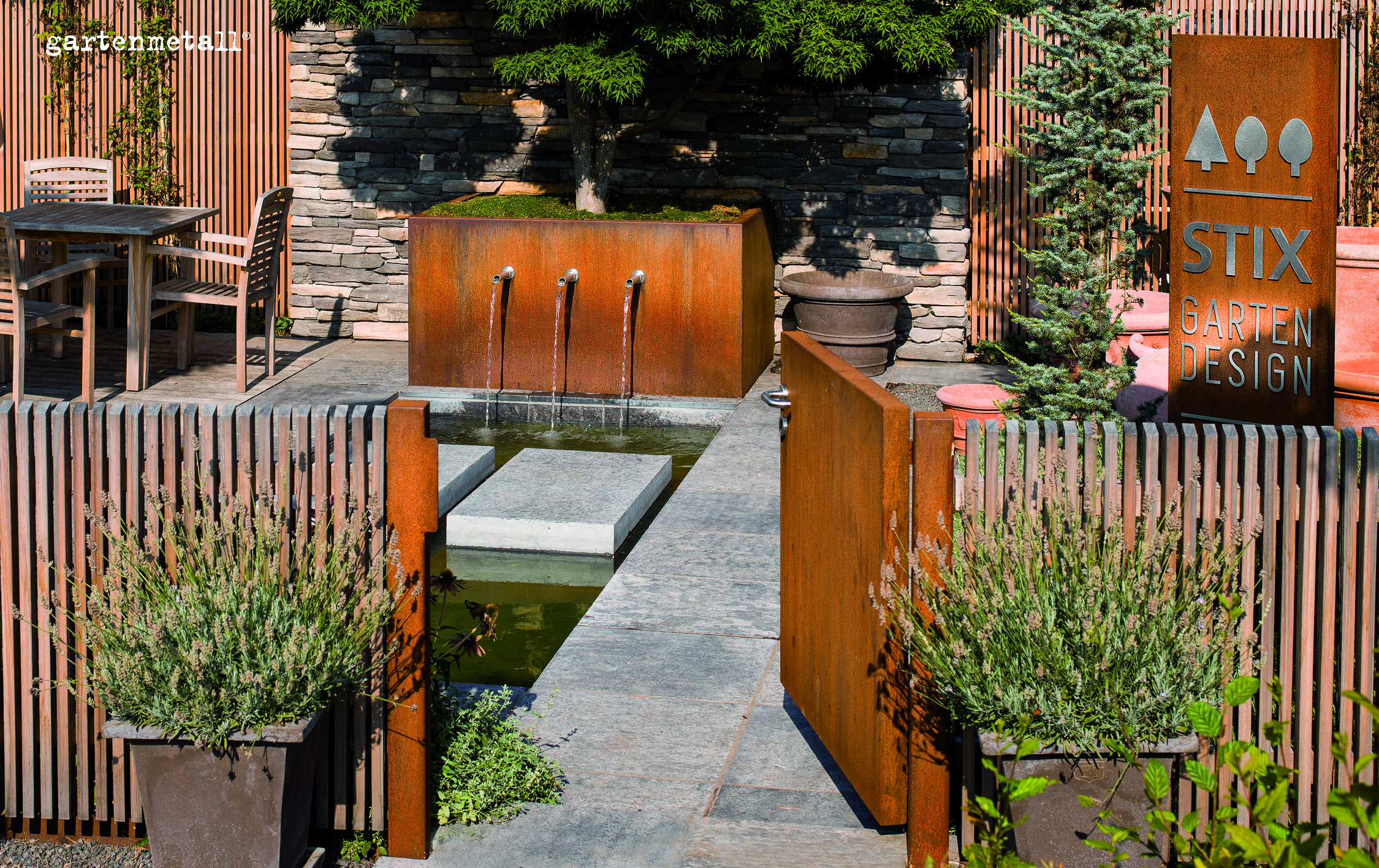 Bei Gartentüren aus Cortenstahl kann es besonders in den ersten Jahren zu einer gewissen Rostablösung von 0,05 mm der Oberfläche kommen. Die Aufstellung so planen, dass diese Rostablösung definiert ablaufen kann.