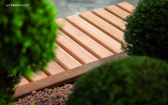 – Die Sitzauflagen stehen 3-seitig (vorne, links, rechts) jeweils 10mm am Unterbau über und werden von unten mit einer Querlattung aus Edelstahl verschraubt, so dass im „Holz“ von oben keine Befestigungsschrauben sichtbar sind. Die komplette vormontierte Sitzauflage wird dann mit Schrauben zwischen den Sitzauflagen auf den Sitzbank Unterbau aufgeschraubt. Alle Schrauben sind aus hochwertigem Edelstahl.
