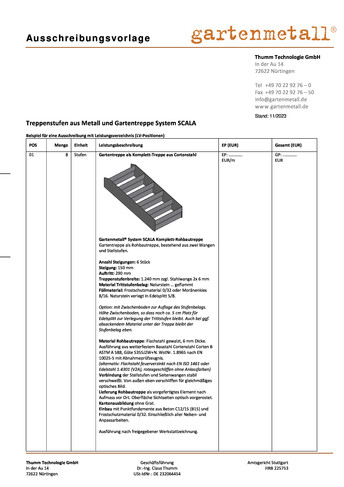 Die Treppenserie SCALA bietet vielfältige Lösungen für stilvolle und funktionale Garten- und Außentreppen. Ob aus massivem Metall oder in Kombination mit Naturstein, die Modelle sind in verschiedenen Formen erhältlich und ermöglichen eine einfache Planung und Montage. Zur Auswahl stehen unter anderem Einzelstufen, Rohbautreppen und Wangentreppen. Passende Geländer sind ebenfalls erhältlich und lassen sich dank des Systembaukastens ohne Schweißarbeiten direkt vor Ort montieren.