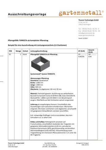 Die Pflanzgefäße und Hochbeete TERRESTA vereinen Funktionalität und Design für Garten, Terrasse oder Balkon. Sie sind stabil, langlebig und dank ihrer komfortablen Höhe besonders rückenfreundlich. Gefertigt aus hochwertigem Metall, vor allem aus Cortenstahl mit seiner warmen Rostoptik, fügen sie sich harmonisch in jede Gartenumgebung ein und lassen sich individuell in Größe und Ausstattung anpassen.