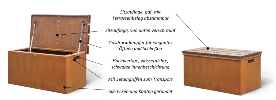 Gartenboxen aus Metall sind auf jeder Terrasse und im Garten nützlich. Sie schaffen Ordnung und bieten Stauraum für alles, was Sie trocken lagern und gut verstauen möchten: Gartenutensilien, Sitzbezüge, Tischdecken, Poolzubehör und vieles mehr. Wer einmal eine solche Auflagenbox genutzt hat, möchte auf diese wahrscheinlich nie wieder verzichten. Die Aufbewahrungsboxen von Gartenmetall aus Metall sind so stabil, dass diese in Ergänzung zur Staufunktion, auch als Sitzbank genutzt werden kann. Durch die vielfältig wählbaren Sitzauflagen und die hohe Stabilität durch die massive Ausführung aus Metall, wird die Gartenbox zur zusätzlichen Designer-Bank auf der Terrasse oder im Garten – mit nützlicher Zusatzfunktion. Mehr lesen >>>