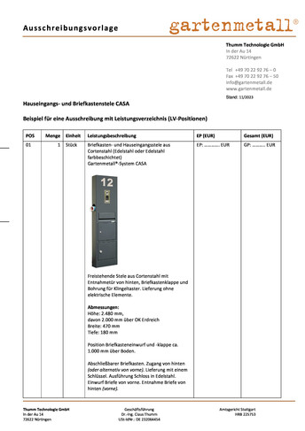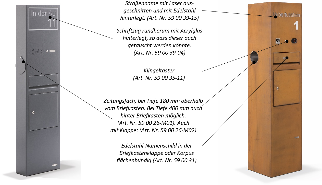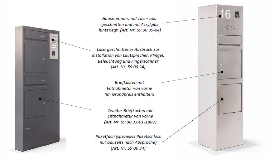 Jedes Haus braucht einen Briefkasten. Mit freistehenden Briefkastenstelen kann in der Planung des Hauseingangsbereichs das Nützliche mit dem Eleganten verbunden werden. Über viele Jahre praktische Erfahrung haben sich bei den Briefkastensäulen CASA viele bewährte Optionen entwickelt. Sie werden individuell ausgewählt und können kombiniert werden. Jeder Säulenbriefkasten wird auftragsbezogen gefertigt, sodass immer alle kombinierbaren Optionen und Abmessungen möglich sind.