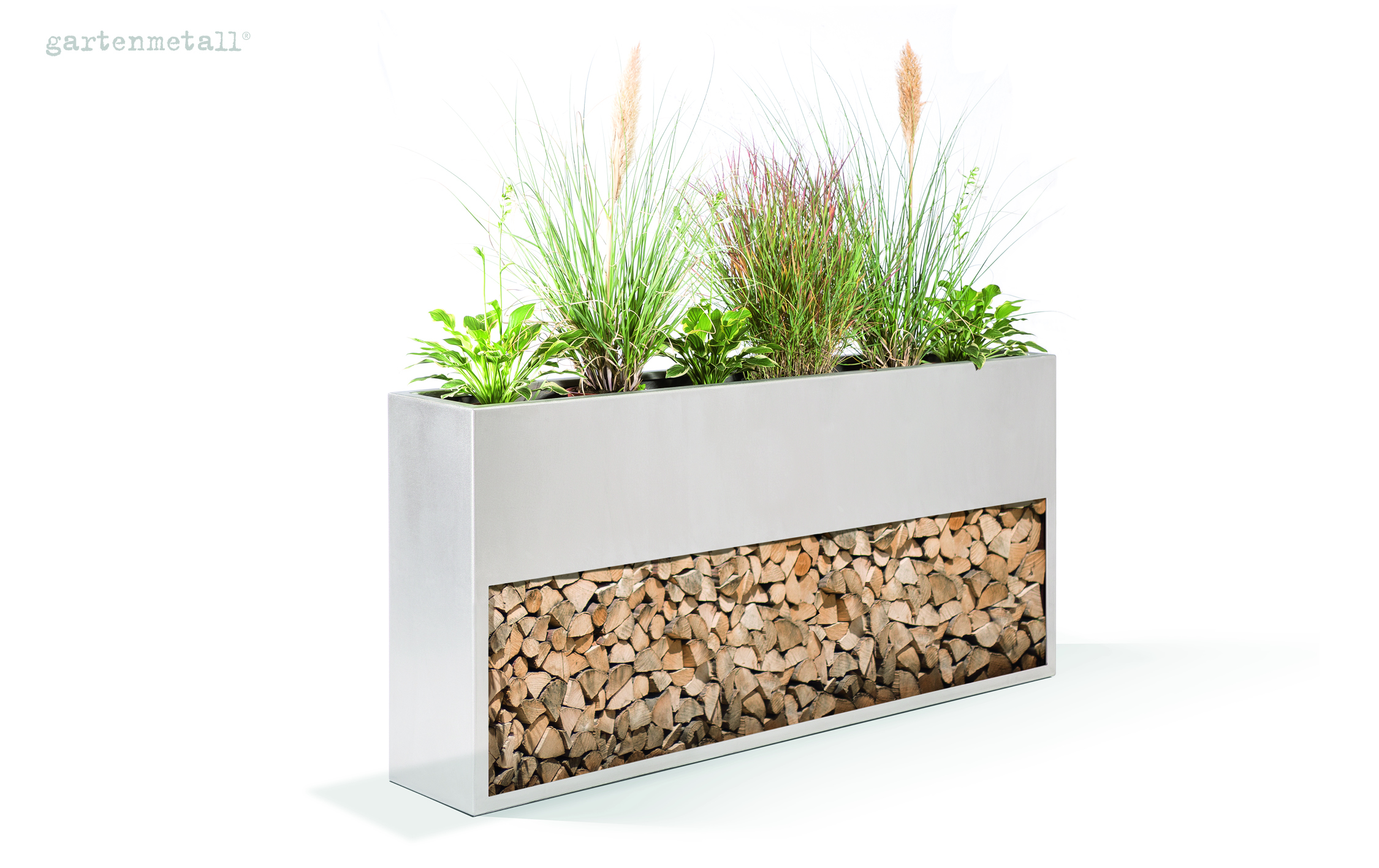 Als Sichtschutz sorgt TERRAN für Privatsphäre und schirmt gezielt Bereiche ab, ohne den Garten abzuschotten. Die integrierte Pflanzfläche bringt Grün auf Augenhöhe, lockert Flächen auf und macht die Wand lebendig. Pflanzen werden Teil der Gestaltung und verändern das Erscheinungsbild im Jahresverlauf ganz natürlich. Ergänzt wird das Ganze durch die Holzlege, die Brennholz ordentlich, griffbereit und sichtbar strukturiert aufnimmt.