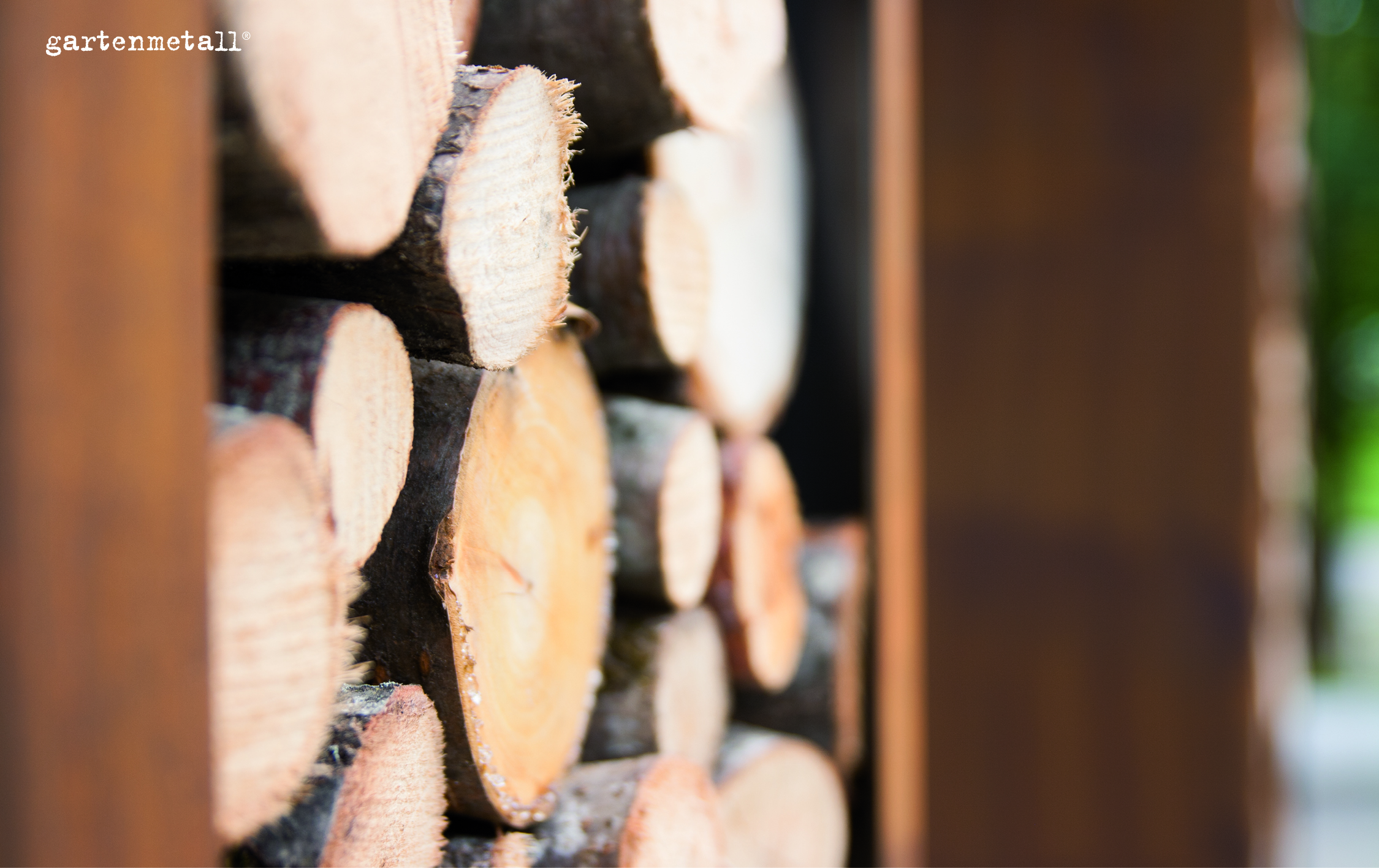 Hinweis: Achten Sie beim Befüllen des Rahmens mit getrocknetem Kaminholz, dass diesem genug Platz zum Ausdehnen bleibt. Bei Regen dehnt sich das Holz aus, was den Rahmen unter erhöhte Spannung/Druck setzen kann. Bitte ausreichende Lücken zwischen den Holzscheitel lassen!