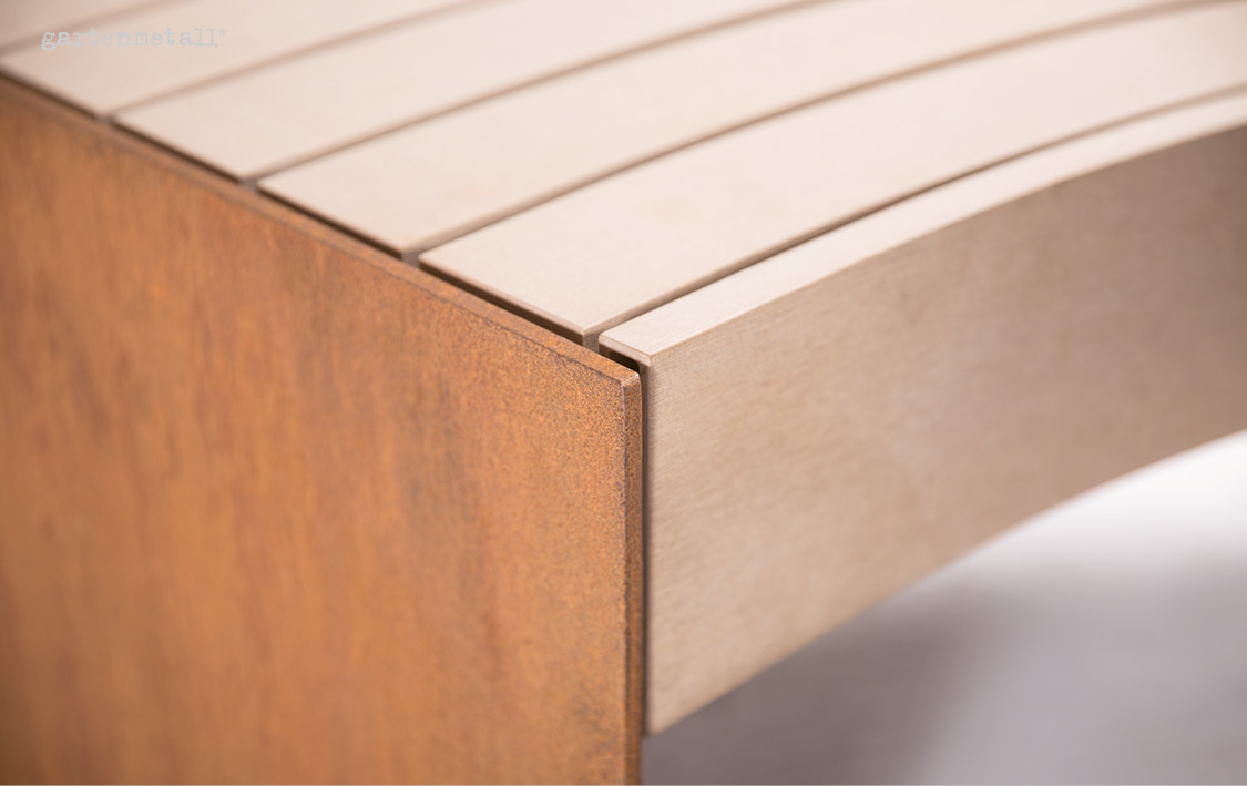 Die Bank strukturiert den Außenraum, ohne ihn zu dominieren. Sie lässt sich frei platzieren, an Wege setzen oder bewusst als Treffpunkt inszenieren. Durch ihre klare Gestaltung fügt sie sich harmonisch in moderne wie zurückhaltende Konzepte ein und bleibt dabei zeitlos.