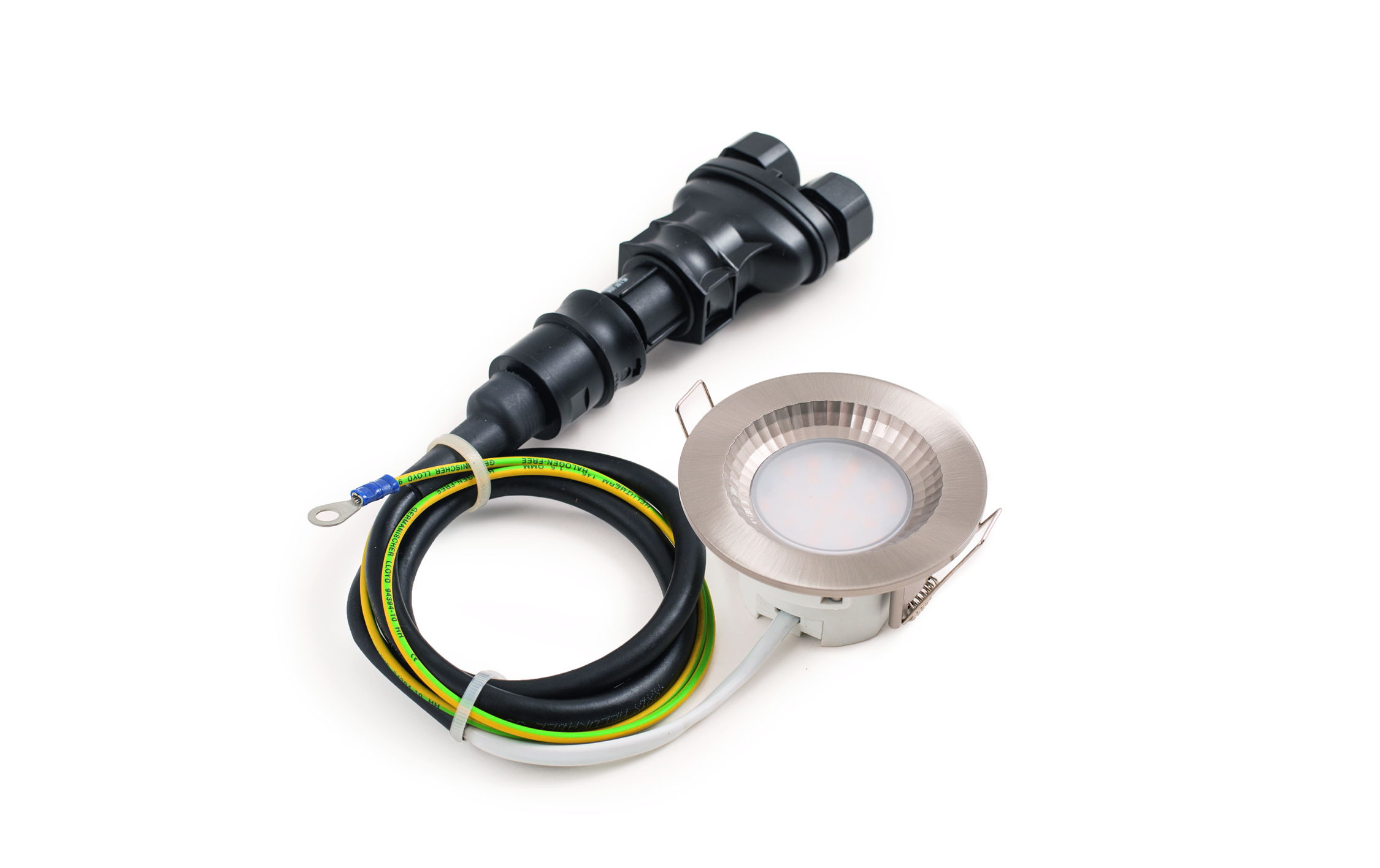 An die bei den Lampen COMO und AREZZO mitgelieferte LED-Einbauleuchte wird ab Werk ein Geräteanschluss-Stecker Typ WIELAND RST2013F mit einer Kabelverlängerung ca. 60 cm und dem notwendigen Schutzleiter mit Ringöse zum Anschluss im Lampengehäuse montiert.